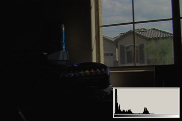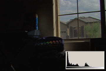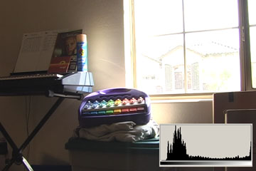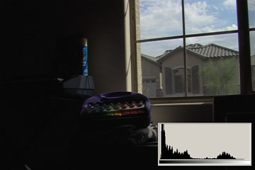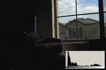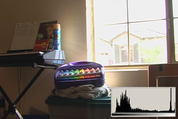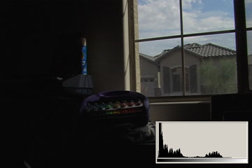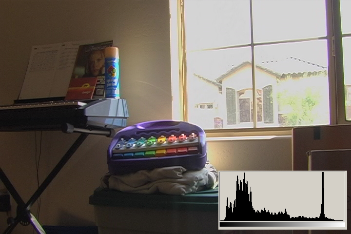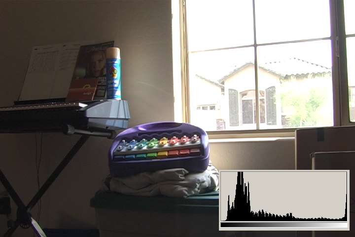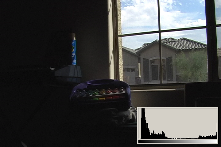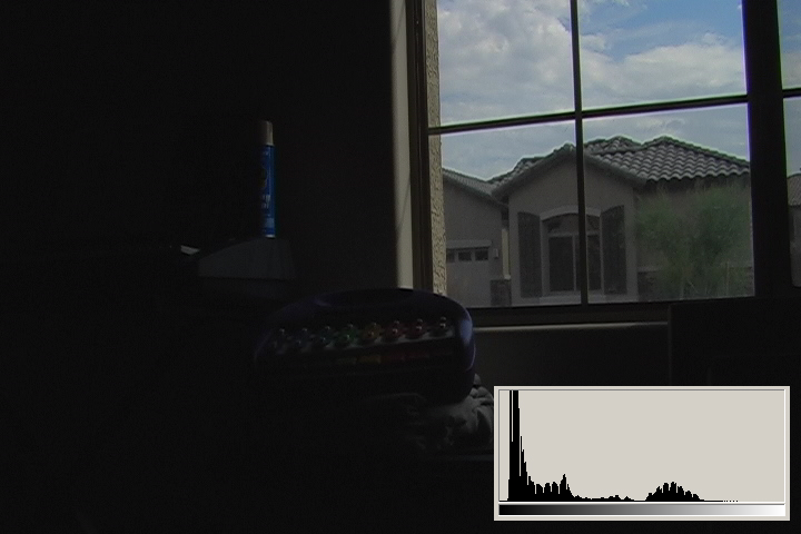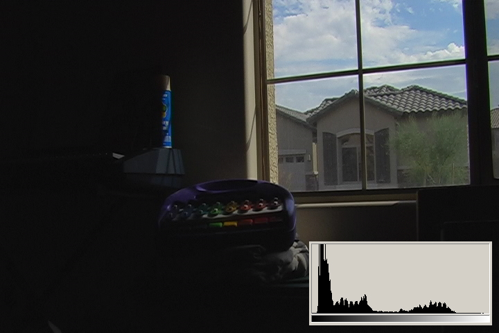3.1 is what we typically expect from consumer digital video cameras when shooting daytime interiors: blown out blobs where the widows are supposed to be. We can actually see just a hint of some of the darker exterior elements, the overhang and shutters. The histogram shows clipped highlights running up the right side at 110IRE/255.